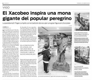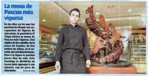 «En una de esas filigranas arquitectónicas que consiguen los pasteleros cuando llega el tiempo de las “monas de Pascua” la gente de la panadería El Trigal de Vigo ha hecho del chocolate toda una escultura evocadora de ese monumento de los caballos que nos dejó Oliveira en la Plaza de España. Héla ahí con sus autores y que viva el chocolate, aunque sea del loro.»