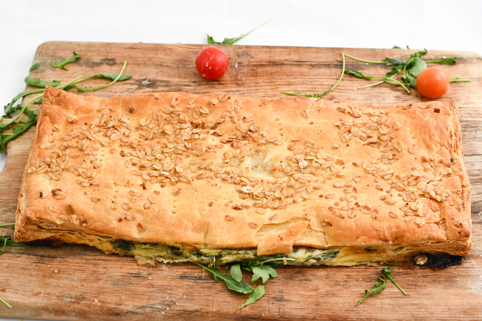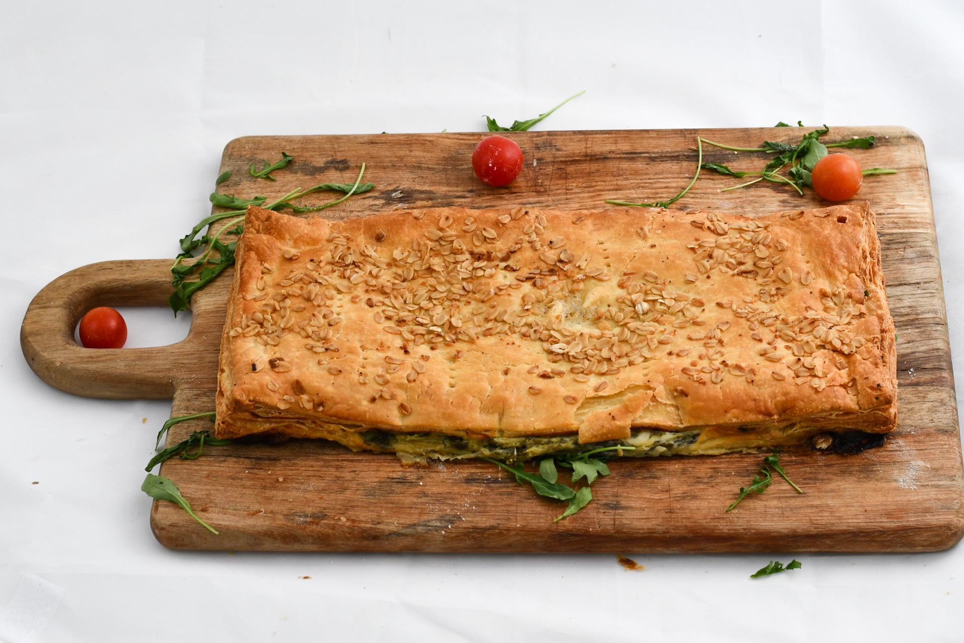 Hojaldre con crema de tetilla gallega y grelos salteados.