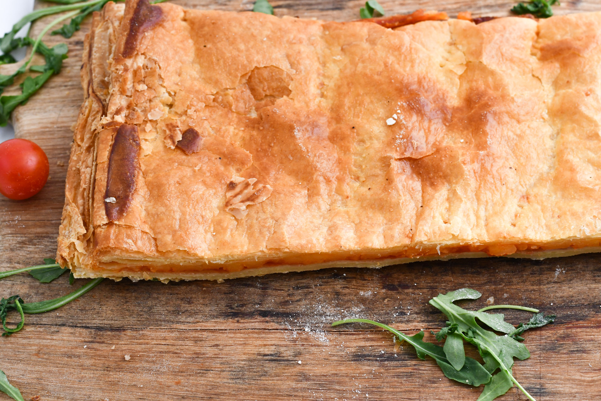 Empanada de hojaldre de 3 quesos y tomate natural.