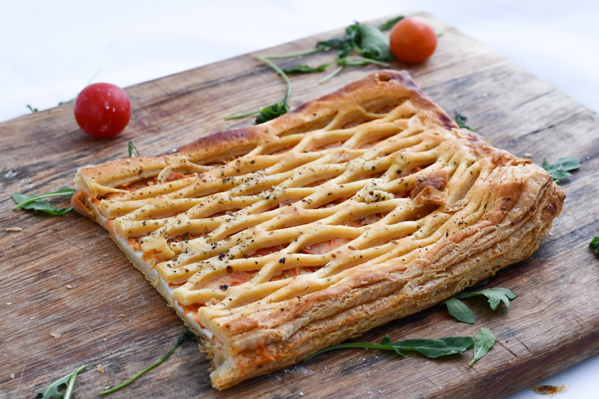 Empanada de red de hojaldre con tomate en rodajas natural, con crema de 3 quesos, albahaca y aceite de oliva.