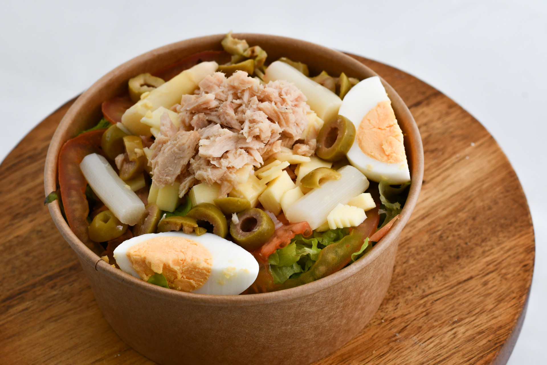 Ensalada de atún, huevo duro, espárrago, aceituna verde, tomate, jamón y queso.