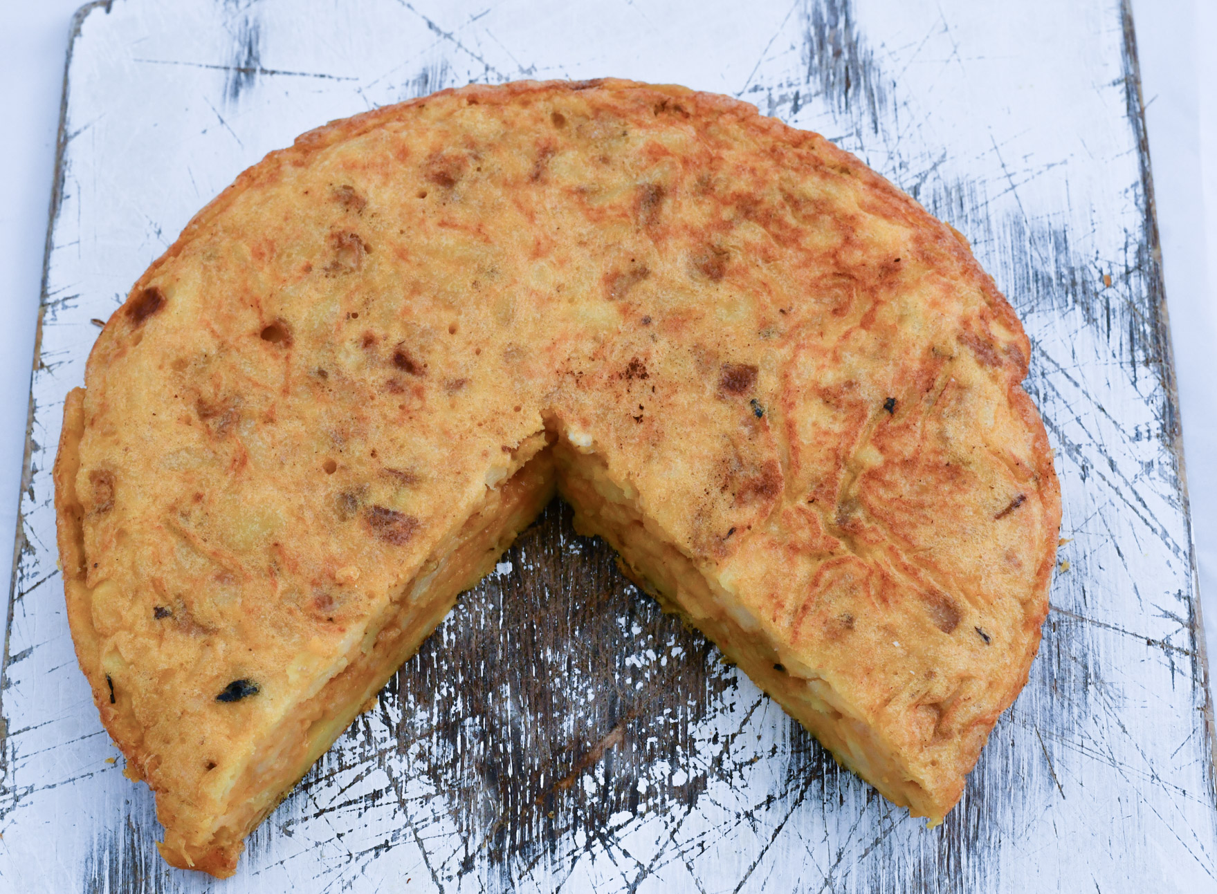 Tortilla de patata artesana con cebolla para 8 pinchos grandes.